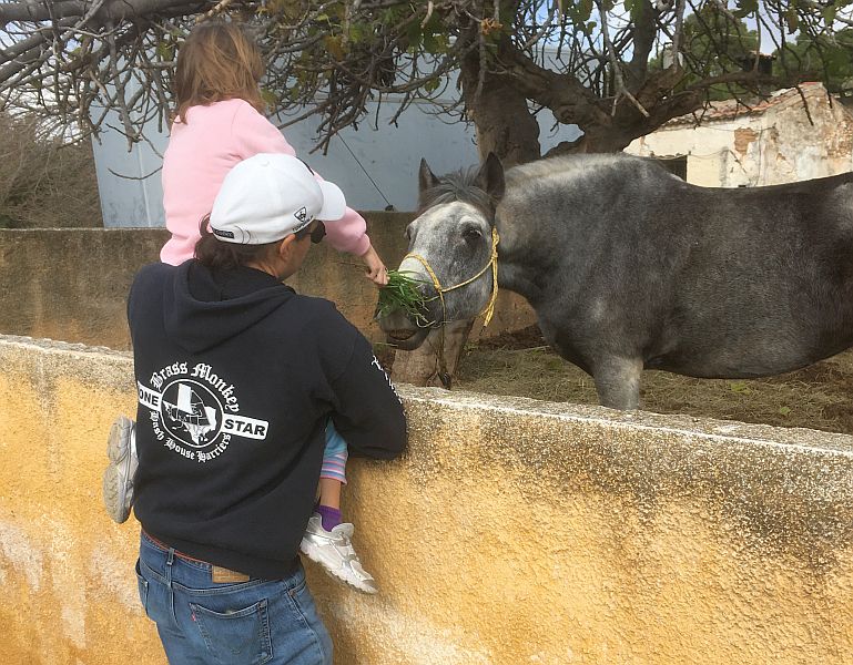 Violet feeds the horse with some grass