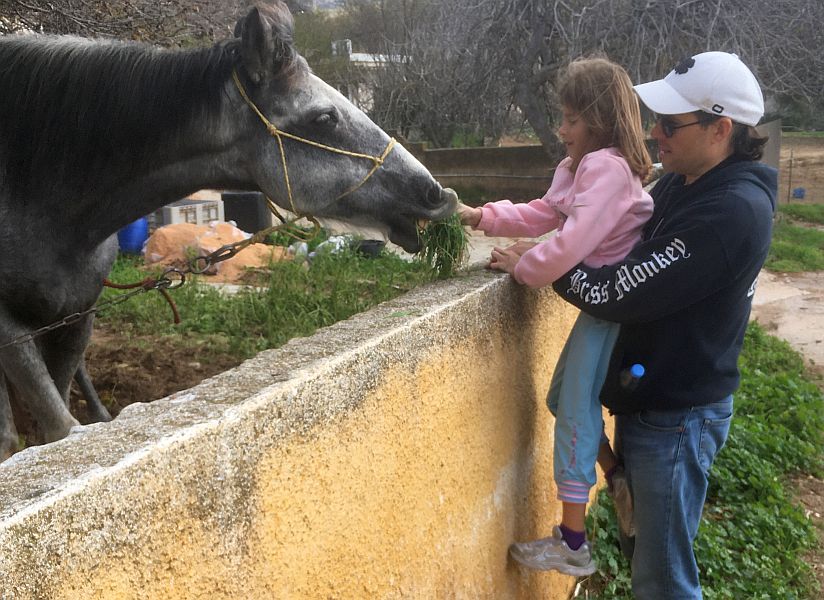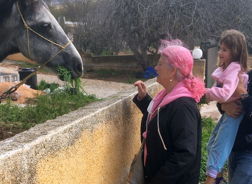 Violet feeds the horse with some grass